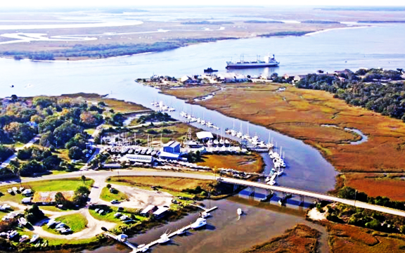 Aerial view of Tiger Point Marina on the north end of Amelia island and the inlet to St. Mary's River from Atlantic Ocean (Source: University of Florida). |